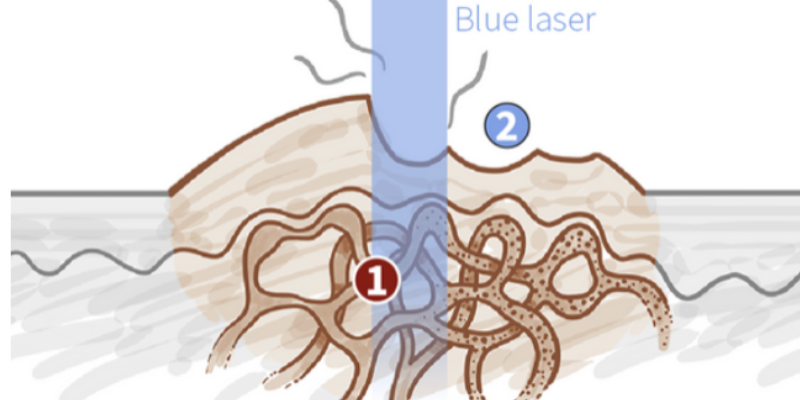 ブルーレーザー(Blauman)は450nmの波長のブルーレーザー技術を使用して、周辺組織の熱損傷を抑え、血管(ヘモグロビン)・メラニンに反応します。