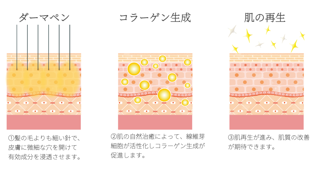 皮膚に微細な傷を作ることで、皮膚が本来もつ傷を治そうとする力を呼び起こして肌を生まれ変わらせる再生治療の一つです。