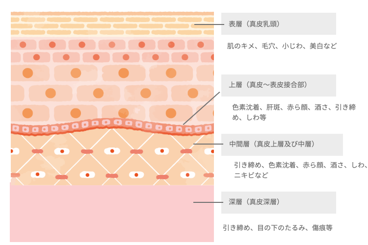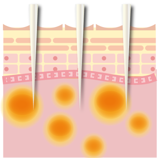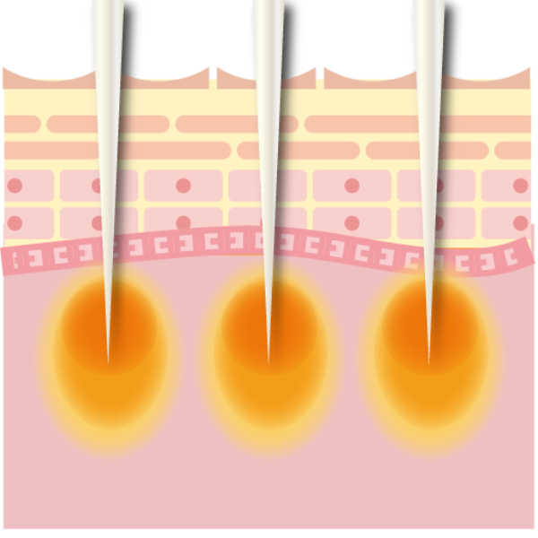 高周波 RF により、皮脂腺と周囲の炎症性血管を熱で凝固させることによって活動性のニキビを改善させます。真皮層にある線維芽細胞を活性化し、コラーゲン・エラスチン・ヒアルロン酸の産生を促すことによってニキビ跡の凹みやたるみ毛穴を改善します。