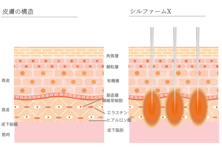 シルファーム X によるマイクロニードル RF 治療とは、マイクロニードル(極細の針)を皮膚に刺し、高周波(RF)を照射する治療です。基底膜~真皮層に熱エネルギーを加えることによって肌の再構築を促し、肝斑の改善や毛穴の引き締め、赤ら顔の改善といった幅広い症状の改善が期待できます。