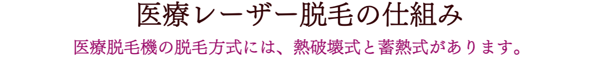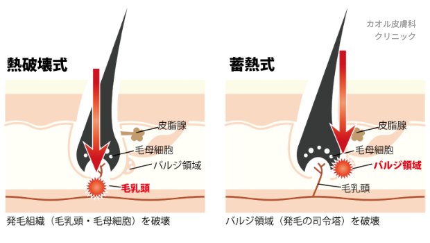高出力のレーザーがメラニン(毛の黒い色素)に反応し、毛根にある発毛組織(毛乳頭・毛母組織)を破壊する熱破壊式と、低出力のレーザーを連続照射してバルジ領域(発毛の指令組織)に熱ダメージを蓄積し、破壊する蓄熱式があります。