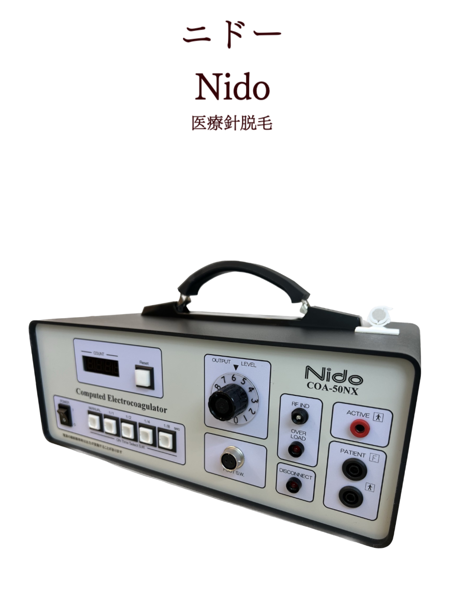 当院では、実績のあるニドー社の針脱毛機器を使用しています。絶縁針を使用しますので、皮膚表面の火傷リスクを抑えた脱毛が可能です。