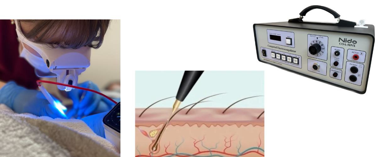 毛穴の一つ一つに細い絶縁針を刺し込み、微弱な電流を流すことで毛根を破壊します。レーザー脱毛によって硬毛化した部位やレーザー脱毛では反応しない白髪治療します。