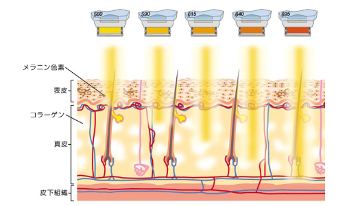 IPL(Intense Pulsed Light)と呼ばれる広範囲の波長の光を用いて、様々なスキントラブルを複合的に治療します。