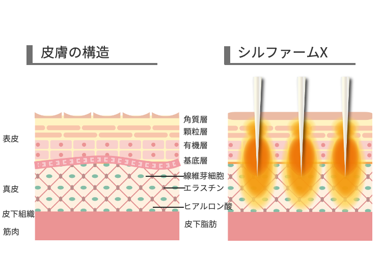 シルファームX は、ターゲット組織に選択的に適量の熱エネルギーを到達させることで、不要な痛み・肌ダメージを最小限に抑えて治療を行います。 シルファームXは基底層の再構築と異常毛細血管を選択的に破壊します。これにより、老化した肌機能が若返り、健康的・正常な状態に生まれ変わることで、難治と言われる肝斑や赤ら顔に有効です。更に熱エネルギーがコラーゲンを生 成することによって小ジワやたるみにも同時に効果を発揮します。