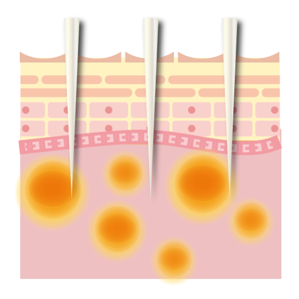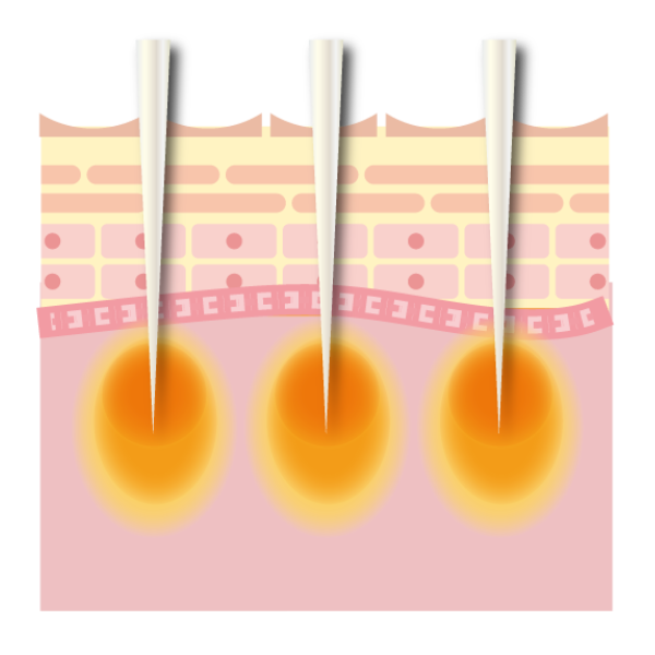 高周波 RF により、皮脂腺と周囲の炎症性血管を熱で凝固させることによって活動性のニキビを改善させます。真皮層にある線維芽細胞を活性化し、コラーゲン・エラスチン・ヒアルロン酸の産生を促すことによってニキビ跡の凹みやたるみ毛穴を改善します
